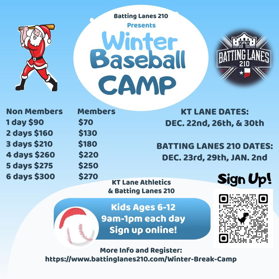 We will be offering 6 days of baseball camp over Winter Break! Each day of camp will be from 9am-1pm for players ages 6-12 years of age. Lunch will be provided by Chick-Fil-A on both Fridays we have camp. All other days bring your own lunch.