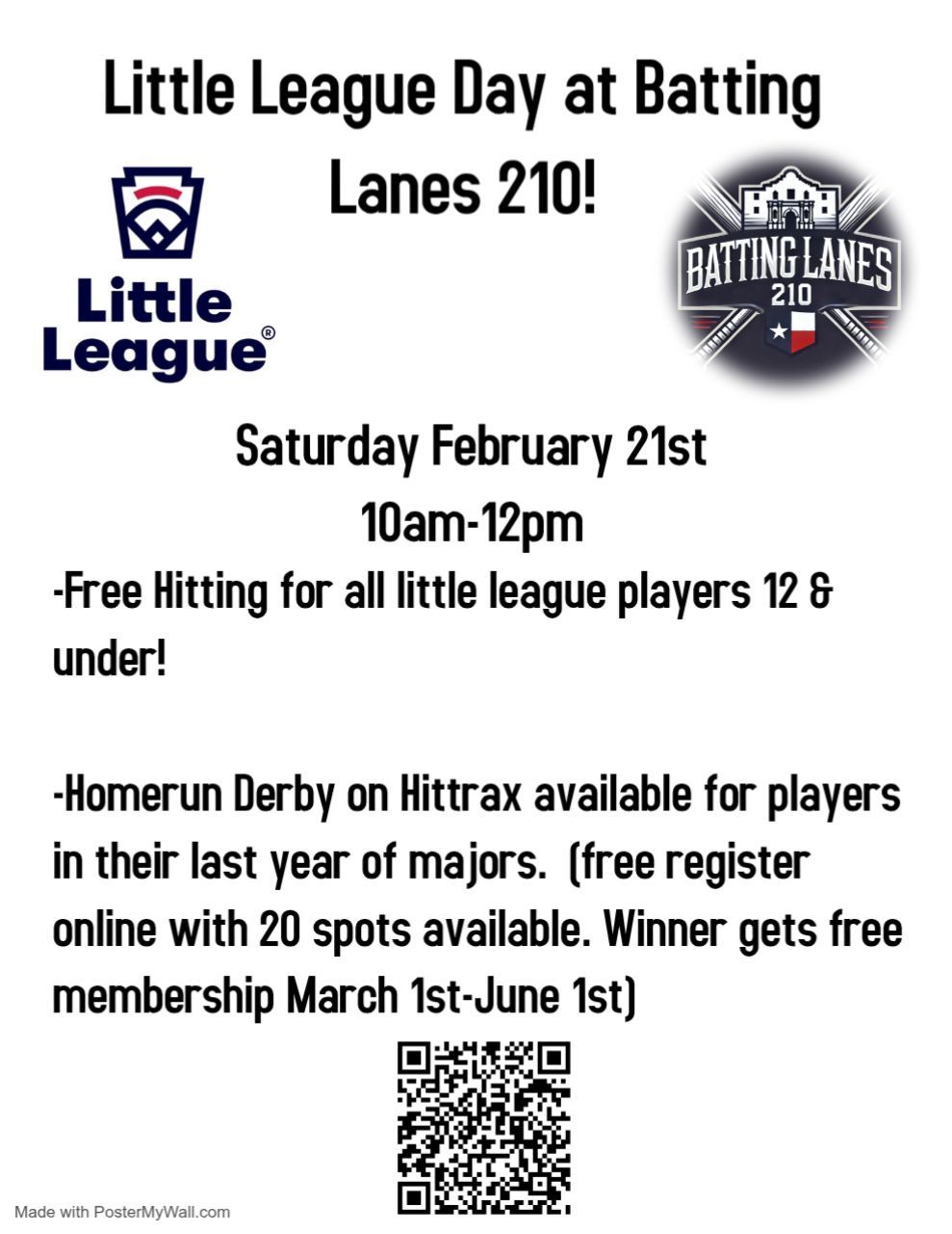 We will also be hosting a hittrax homerun derby to the first 20 majors players that register who are in their last year of majors (11 and 12 year olds). The winner will get a free membership to Batting Lanes 210 from March 1st-June 1st!