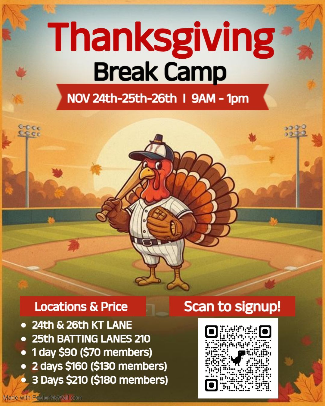We will b e having a 3 Day camp over Thanksgiving Break 9am-1pm each day November 24th-26th. Monday and Wednesday Camp Location will be at KT Lane Athletics. Tuesday location will be a Batting Lanes 210.